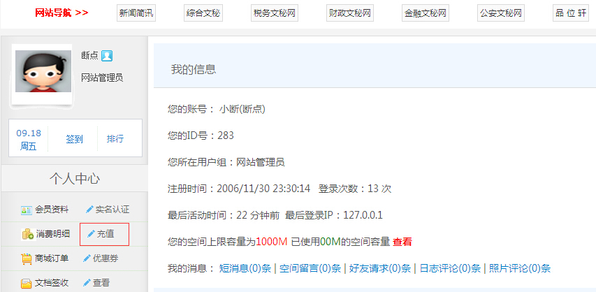 第三步: 会员中心左侧 选择我的面板 点 充值