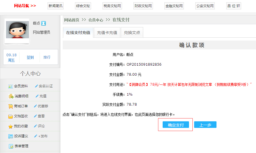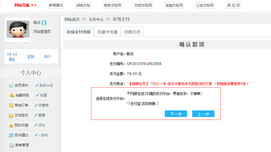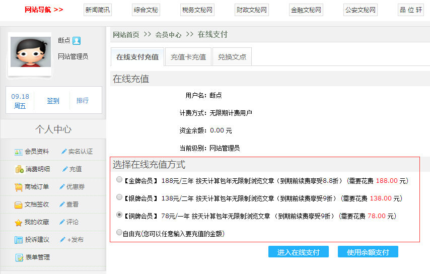 第二步: 登陆后点击 会员中心  或   在线支付